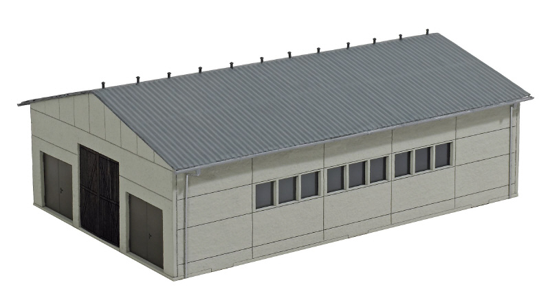 Modell eines LPG-Gebäudes, wie sie seit den sechziger Jahren in der ehemaligen DDR entstanden sind. Das Original diente als Färsenaufzucht (»Färse« ist ein weibliches Hausrind, das noch nicht gekalbt hat). Das Gebäudemodell aus Spezialkarton wird in der neusten »Laser-Cut«-Technologie gefertigt und ist farblich nachbehandelt, um die Betonstruktur des Vorbildes authentisch darzustellen. Die zahlreichen Zurüstteile, wie Regenrinnen, Fallrohre, Fensterrahmen, Scheiben und Belüftungsrohre auf dem Dach, bestehen aus filigranen Kunststoffspritzgussteilen. Das Gebäude verfügt an den Stirnseiten über je drei Tore, die man auch in geöffnetem Zustand präsentieren kann. Mit mehreren Bausätzen können größere Anlagen gebaut werden. Das Gebäudemodell ist auch ideal geeignet, um »zweckentfremdet« zu werden, denn viele der ehemaligen LPGs dienen inzwischen neuen Verwendungszwecken. Sie beherbergen heute Baumärkte, Garten-Center, Kfz-Werkstätten und kleinindustrielle Hersteller. Entsprechender Ausschneidebogen liegt bei. Bausatz.