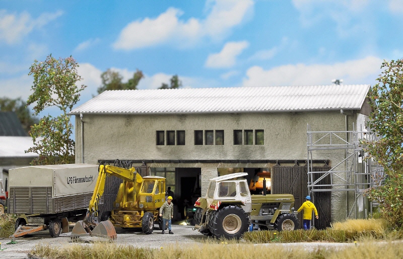 Werkstatt für die Wartung und Pflege der landwirtschaftlichen Fahrzeuge. Material und Ausstattung entsprechen dem Bausatz der LPG Stallung. Das Gebäude verfügt über zwei Stockwerke. Im unteren Bereich befindet sich die Wartungshalle mit den großen Schiebetoren und den großflächigen Werkstattfenstern, im Obergeschoss die Büroräume, die in der H0-Ausführung über eine Außentreppe zugänglich sind. Bausatz.