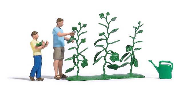 Mann und Junge, die Gurken ernten. Mit 3 Gurkenpflanzen und Gießkanne. Angaben zur Produktsich...