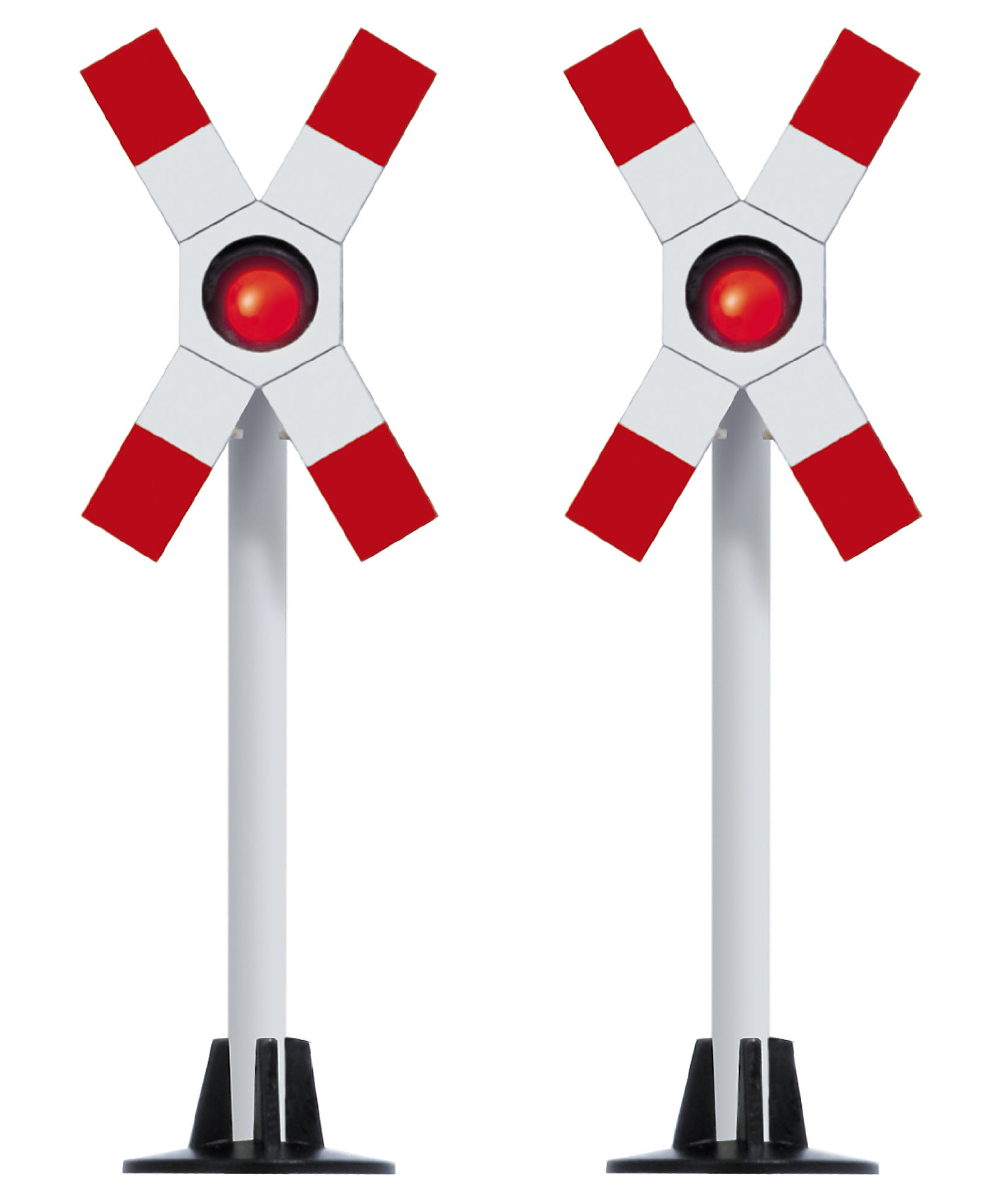 2 typische Andreaskreuze wie sie in der ehemaligen DDR zum Einsatz kamen und auch heute noch Verwendung finden. Eine elektronische Blinkschaltung und LEDs sorgen für wartungsfreien Dauerbetrieb. In Verbindung mit IR-Lichtschranke und Zeitschalter (26-5961) können die Warnblinker durch Zugannäherung automatisch eingeschaltet werden.