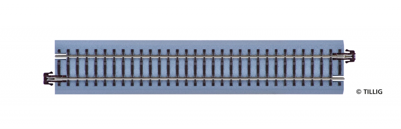 166 mm (für Analogbetrieb, bei Digitalbetrieb Entstörkondensator entfernen), Gerades Anschlussgleis mit Entstörkondensator inkl. Schienenverbinder mit Anschlusselement, Anschlusskabel mit Kabelsteckhülsen sind unter der Bettung angebracht.