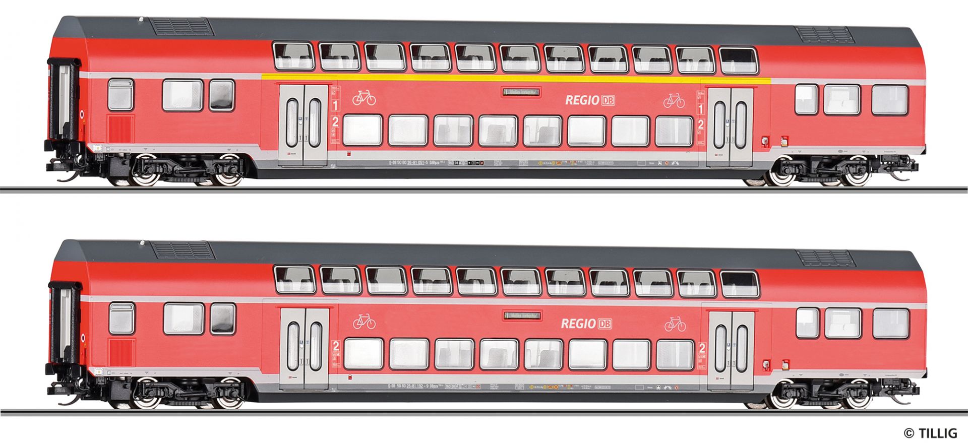 Reisezugwagenset „DB Regio“ der DB AG, bestehend aus einem 1./2. Klasse Doppelstockwagen DABpza 785.2 und einem Doppelstockwagen DBpza 780.4