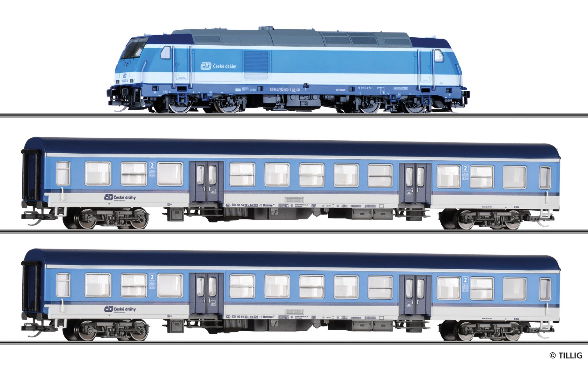 Einsteiger-Set: Reisezug der ČD, bestehend aus Diesellokomotive „TRAXX“ und zwei Reisezugwagen, Bauart Halberstadt
